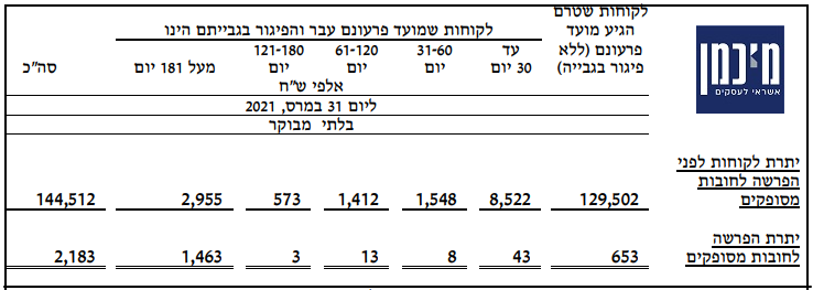 מיכמן בס"ד, כמדומני, היא חברת האח"ב התל אביבית הראשונה שנתנה גילוי רבעוני לנתוני חובות בפיגור. היא עשתה זאת בביאורים לדוח הכספי הרבעוני הראשון שפרסמה כחברה ציבורית (דוח 1Q21):