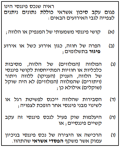 - לקוחות שנקלעו ל"אירועי כשל [אשר] הינם, בין היתר, פיגור של הלווה בהחזר החוב מעל 90 יום, כניסה להליך של פירוק או כינוס נכסים";