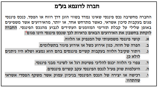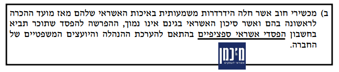 - קטעים חדשים הלקוחים מהתשקיף של מיכמן (כמו גילוי כמותי לחובות בפיגור בפורמט טבלת הגיול לעיל);