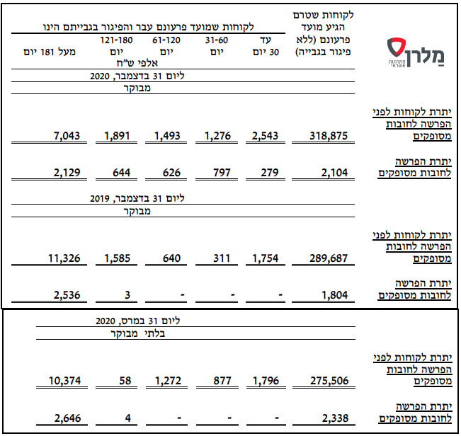 אז צל"ש גדול למיכמן, וגם למלרן. אבל לא נשכח כי מלרן לא גילתה כלום אודות חובות בפיגור ולא גילתה כלום על יתרת ההפרשה להפסדי אשראי בשלושת הרבעונים הראשנים של 2020. ממש כלום: היא רק דיווחה על הנטו של תיק האשראי, על גבי מאזני 31.3.20, 30.6.20 ו-30.9.20, אבל לא גילתה מהי יתרת הברוטו של התיק ומהי יתרת ההפרשה. יחד עם זאת, ייאמר לזכותה, כי בדוחות הרבעונים של 2021 היא השלימה חוסרים והציגה מספרי השוואה "מלאים" אודות חובות בפיגור ואודות הפרשה להפסדי אשראי בשלושת הרבעונים של 2020.