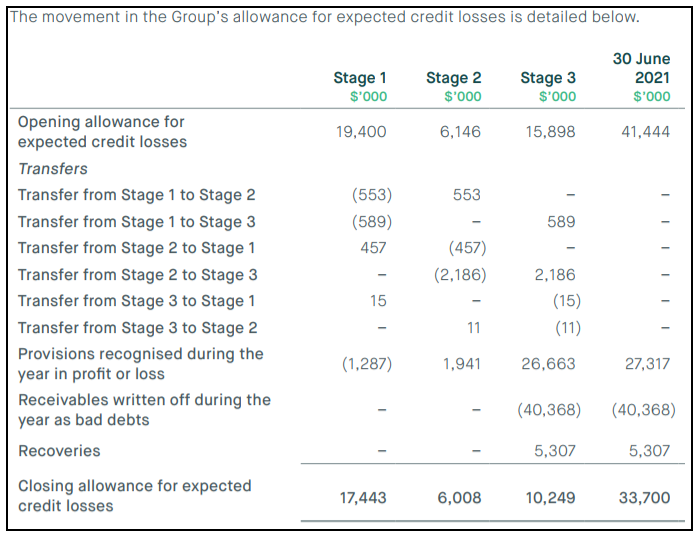כמתואר בפרק 2, חברות המצייתות באופן מלא לבקשות IFRS 7 בקשר עם גילוי בתנועה בחשבון הפרשה ובקשר עם גילוי לתנועה בחשבון הברוטו (המסייעת להבנת התנועה בחשבון ההפרשה) מציגות גם תנועה אופקית, קרי תנועה של סכומים בין שלושת שלבי ה-IFRS. הנה למשל, טבלת התנועה בחשבון הברוטו של פרוספה האוסטרלית לשנה הפיסקלית המסתיימית ביום 30.6.2021: