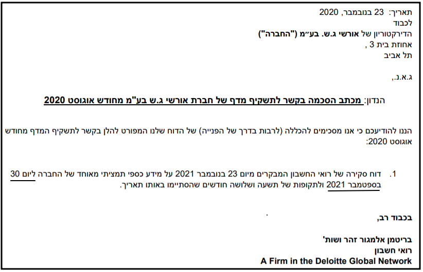 גם אם כן, הדוחות הרבעוניים של אורשי הם הדוחות הכספיים הנכללים בתשקיפי המדף של אורשי. למשל, דוח הצעת מדף זה מיום 20.1.2022, מדווח על "הסכמת רואי החשבון המבקרים של החברה, להכללה (לרבות בדרך של הפניה) של חוות הדעת ודוחות הסקירה שלהם לדוחותיה הכספיים של החברה". ואכן, רואי החשבון הסכימו להכללת דוח 3Q21 בתשקיף המדד לגיוס של כ-90 מיליון ש"ח: