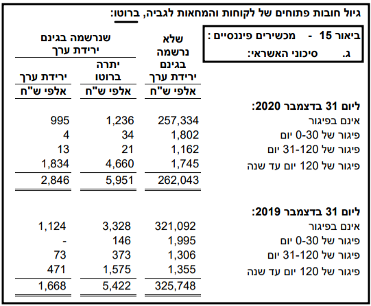 בטבלת הגיול שבביאור 15 (ת' 5 לעיל), יתרת החובות בפיגור של יום אחד ויותר ביום 31.12.2020 היא 9,424 אלפי ש"ח, סכום הקרוב מאד לסכום המוצג בדוח הגיול המובא בחלק אחר של הדוח השנתי (בפרק "תיאור עסקי החברה"):