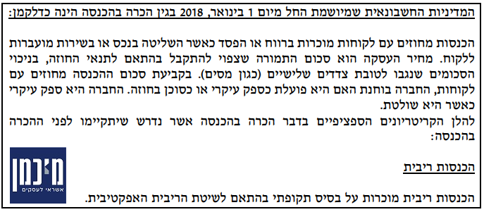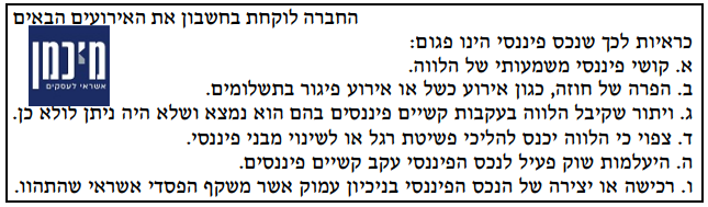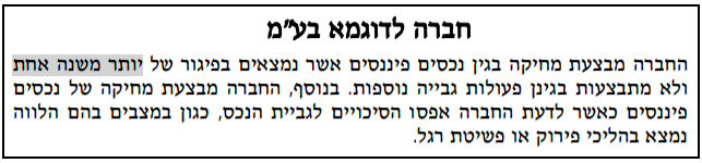 - קטעים חדשים הלקוחים מהתשקיף של מיכמן (כמו גילוי כמותי לחובות בפיגור בפורמט טבלת הגיול לעיל);