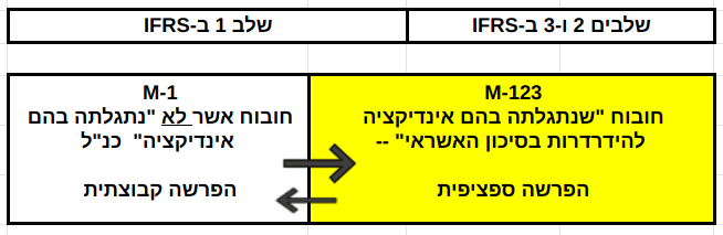 על כן, אקרא לקטוגריית החובות שבגינה חושבה הפרשה ספציפית בשם "שלב M-123" ולקטגוריית החובות שבגינה חושבה הפרשה קבוצתית" בשם "שלב M-1". הנה הקשר בין שלושת שלבי ה-IFRS לבין שני שלבי מלרן-מיכמן: