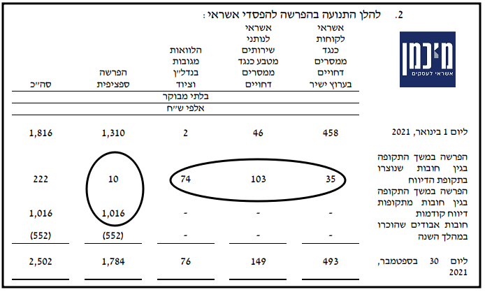 נשאלת השאלה, מה מייצגים המסרים 1,016 ו-10 בעמודת ההפרשה הספציפית. אם הפעם נאמין לכותרות מימין, אז ה-1,016 אמור להיות עדכון ליתרת הפתיחה של ההפרשה הספציפית (שהיא בגין ברוטו של 3,104 ביום 31.12.20). וה-10 אמור להיות הפרשה ספציפית בגין הלוואות שהועמדו בתשעת החודשים הראשונים של 2021 והגיעו לשלב M-123 ב-30.9.2021.