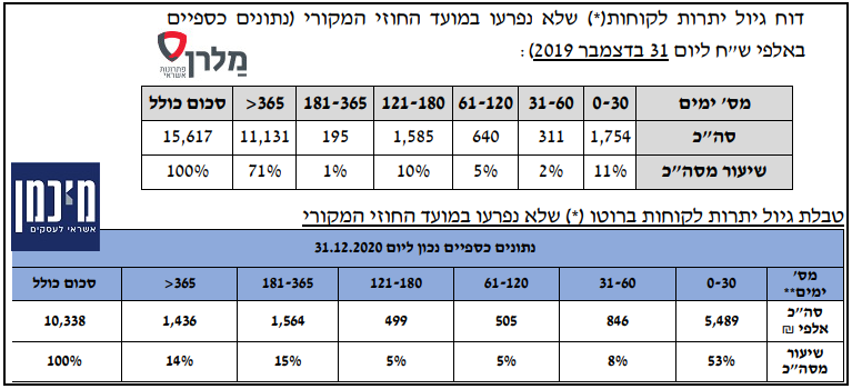 - במהלך רבעון 4Q20, יתרת הברוטו של התיק גדלה בכ-40M ש"ח, בעוד שיתרת שלב M-123 קטנה בכ- 13M, מבלי שבוצעו מחיקות. כך שברור שהייתה תנועה נטו של חובות משלב M-123 אל שלב M-1 באותו רבעון.