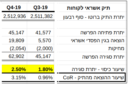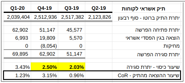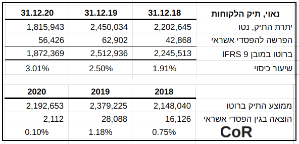 במסגרת הבירור מה הביא לגידול, הנראה חריג בגודלו, בשיעור הכיסוי בשנת 2019, שבסופו של יום גרם לכאורה ליחס CoR נמוך באופן חריג בשנת קורונה הראשונה, נתמקד כעת בהשוואה בין מספרי רבעון טרום קורונה האחרון (4Q19) לרבעון קורונה הראשון (1Q20). הנה המספרים הרלבנטים לתיק אשראי לקוחות שעליהם דיווחה נאוי: