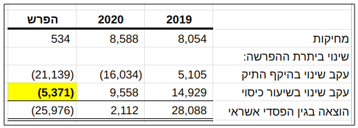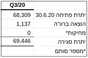 בשנת 2020, כאמור, מחיקות בסך של 643K ש"ח בוצעו ברבעון השני. החישוב הבא מראה כי ברבעון השלישי בוצעו אפס מחיקות (השורה "הוצאה ברוו"ה", היא סך השורה "הוצאות חובות מסופקים ואבודים" בניכוי הפסד מירידת ערך השקעה באג"ח סחיר שנאוי כוללת בשורה זו):