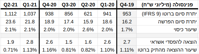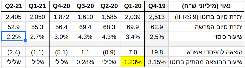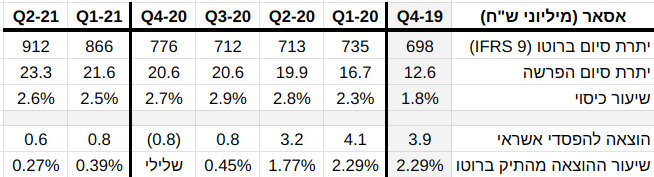 התמונה הבאה היא שקף מתוך מצגת של בנק דיסקונט מיום 16.8.21 (למען הבהירות, הוצאתי מתוכה מידע של שיעורי מחיקות והוספתי מידע על שיעורי כיסוי):