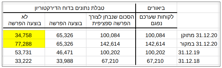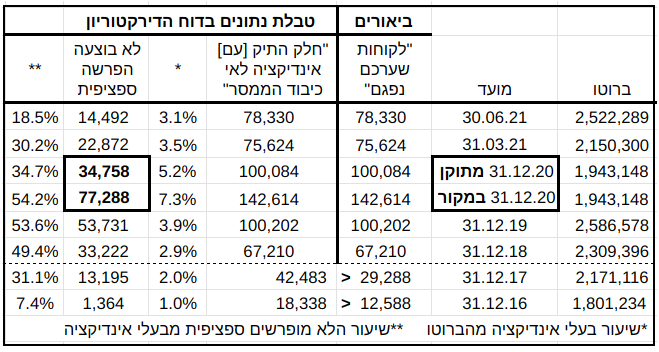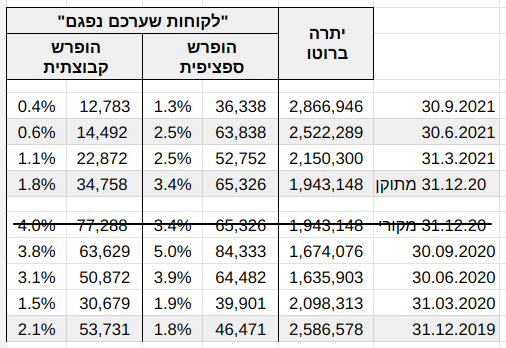 כך למשל, השוו את נתוני 31.12.2019, מועד שקדם לקורונה, לנתונים המתוקנים ליום 31.12.2020. סך החובות הפגומים שהופרש בגינם ספציפית עלה, הן אבסולוטית והן כשיעור מהברוטו, ואילו סך החובות הפגומים שהופרש בגינם קבוצתית ירד, הן אבסולוטית והן כשיעור מהברוטו. כנ"ל עולה מהשוואת נתוני 31.3.2020 (לפני התיקון) לנתוני 31.3.2021 (לאחר התיקון).