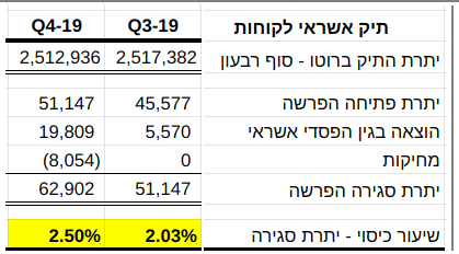 וכך גם ניתן לראות כי בשנת 2019, מלוא היקף המחיקות השנתי כלול ברבעון הרביעי (הסכום בשורה "הוצאה ברוו"ה" הוא הסכום בשורה "הוצאות חובות מסופקים ואבודים" בדוח רוו"ה בניכוי הפסד מירידת ערך השקעה באג"ח סחיר, שנאוי כוללת בשורה זו):