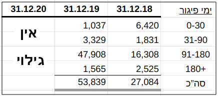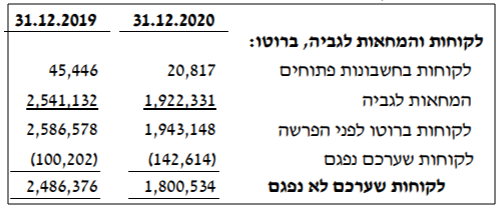 - "ליום 31.12.19, סך "החובות שערכם נפגם", כ-100 מ' ש"ח, גבוה משמעותית, מסך החובות בפיגור, כ-54 מ' ש"ח.