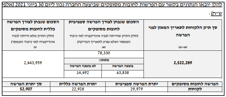 הזהות בין היתרה המכונה בביאורים לדוחות הכספיים "לקוחות שערכם נפגם" לבין היתרה המכונה בדוח הדירקטוריון "חלק התיק שהייתה לגביו אינדיקציה לאי כיבוד הממסר" קיימת בכל דוח תקופתי מאז אימוץ IFRS 9, שבו ניתן גילוי ליתרה המכונה "לקוחות שערכם נפגם" (דוחות שנתיים ל-2018, 2019 ו-2020 ושלושת הדוחות הרבעוניים לשנת 2021).