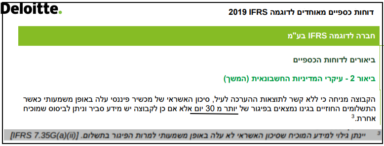 כזכור מפרק 2, כאן, IFRS 7 מבקש מחברה הסוטה מברירת המחדל שקבע IFRS 9 לזיהוי חובות SICR — קרי, 30 ימי פיגור — לתאר ולהסביר את המידע והראיות שעליה התבססה להפרכת החזקה. הערת שוליים 3 בדוחות לדוגמה של DELOITTE משקפת את הוראת גילוי זו.