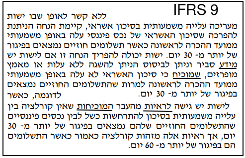 קוראי הדוחות יכולים להעלות השערה, סבירה בעיני, כי המספרים בעמודה "יתרת ברוטו, שנרשמה בגינם ירידת ערך" קרובים מאד ליתרות החובות הפגומים עקב סיכון אשראי, כהגדרתם ב-IFRS 9. זאת משום, שכמוסבר כאן בפרק 1, הגדרת IFRS 9 לחוב ספציפי שהינו פגום דומה מאד להגדרה ב-IAS 39.
