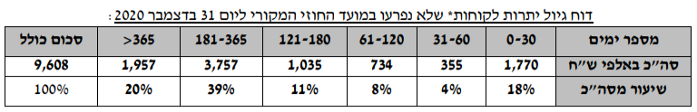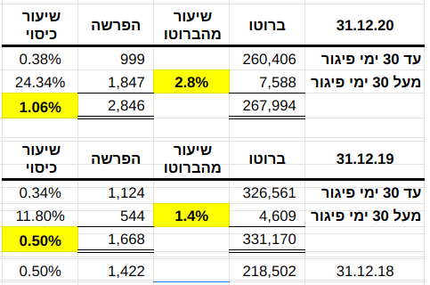 בטבלת הגיול שבביאור 15 (ת' 5 לעיל), יתרת החובות בפיגור של יום אחד ויותר ביום 31.12.2020 היא 9,424 אלפי ש"ח, סכום הקרוב מאד לסכום המוצג בדוח הגיול המובא בחלק אחר של הדוח השנתי (בפרק "תיאור עסקי החברה"):